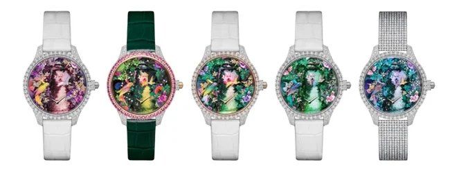表盘之上,由珍珠母贝雕琢的叶片与金质枝蔓勾勒出一条蜿蜒小径,通向画面深处的Les Rhumbs别墅宅邸;玫瑰花茎缱绻缠绕,璀璨宝石点缀着玫瑰花蕊,熠熠生辉;金色鹦鹉身披流光溢彩的羽翼伫立枝头……轻启机械动偶装置,仿佛一场梦境在表盘启幕——蜜蜂、蝴蝶与蜂鸟在玫瑰与枝叶间轻盈飞舞,共同加入这场流光盛宴。